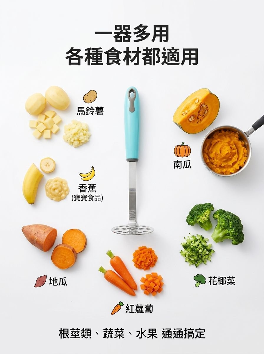 ● 多功能設計,不僅適用於馬鈴薯,還可壓碎蔬菜、水果及豆類,滿足多樣料理需求,一機多用。